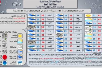 توقعات الطقس خلال الـ24 ساعة القادمة بورتسودان 4-8-2025 (سونا)- توقعت الهيئة العامة…