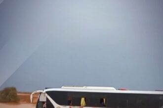 لقطات تظهر جانبا من معاناة سائقي الباصات بسبب سيول اجتاحت طريق شريان…