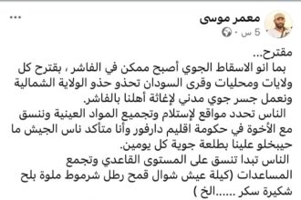 تَنسيقية لجان المقاومة – الفاشر بيان تأييد وتبني لمقترح الجسر الجوي المدني لإغا…