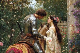 In a romantic pre-Raphaelite style, a tender moment unfolds between a handsome…