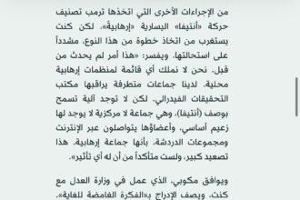 عن توقيع #ترمب لقرار تنفيذي يصنف حركة “انتيفا” اليسارية ارهابية. نقاط مهمة طرح…
