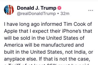 #ترمب وتهديد صباحي لتيم كوك من شركة أبل بفرض ٢٥٪ من التعرفات الجمركية ان لم يصن…