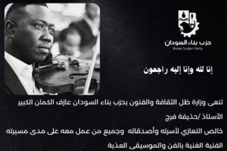 تنعى وزارة ظل الثقافة والفنون بحزب بناء السودان عازف الكمان الكبير حذيفة…