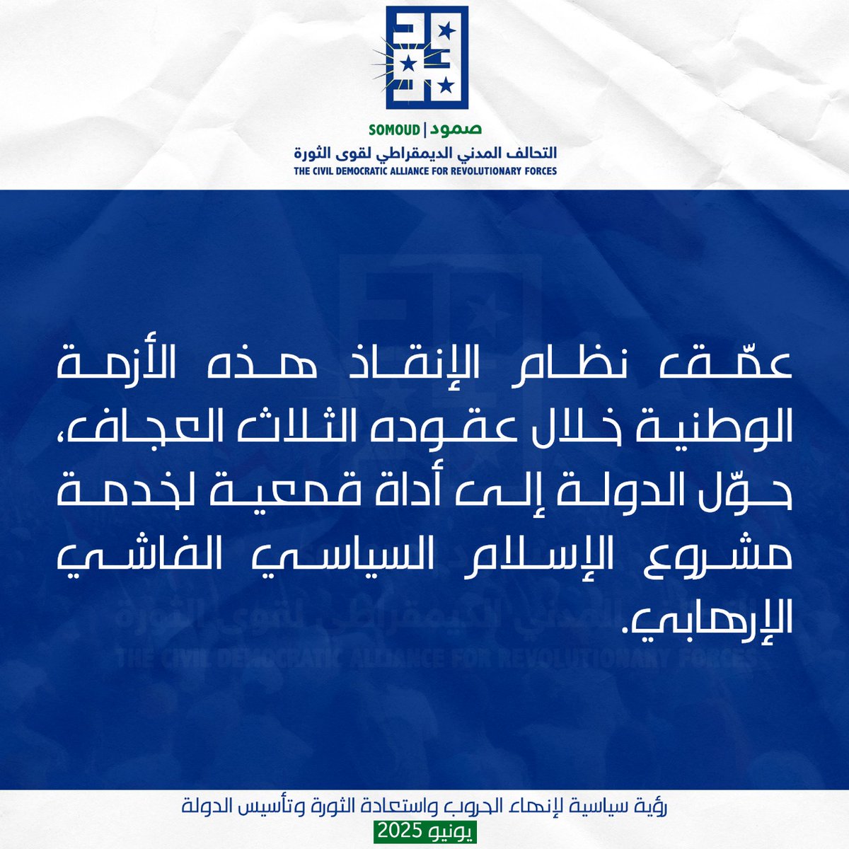 تحالف “صمود” : عمّق نظام الإنقاذ هذه الأزمة الوطنية خلال عقوده الثلاث العجاف، حوّل الدولة إلى أداة قمعية لخدمة مشروع الإسلام السياسي الفاشي الإرهابي.