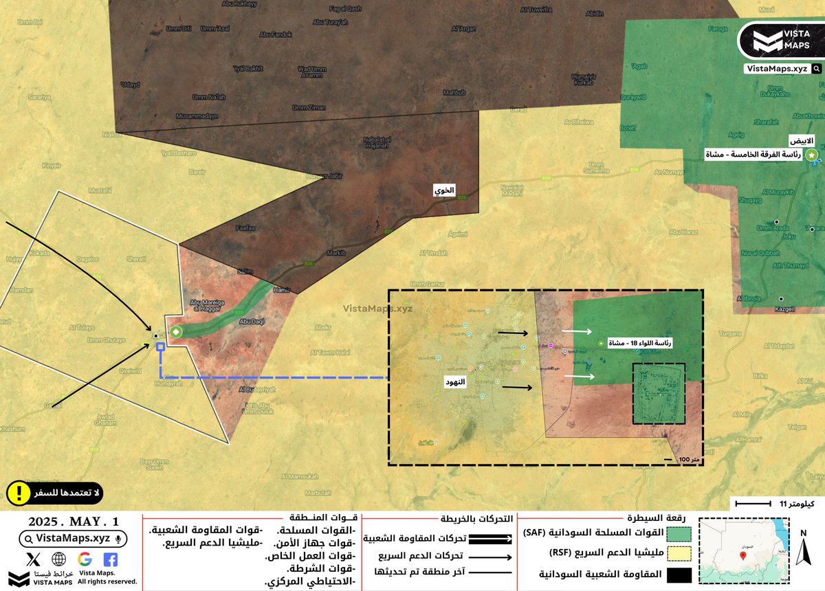 – حتى لحظة كتابة هذا التقرير ما تزال القوات المسلحة تسيطر بالكامل على رئاسة اللواء 18 مشاة، مع وصول تعزيزات من المقاومة الشعبية والقوات النظامية استعدادًا لخوض معركة حاسمة شرق المدينة.
