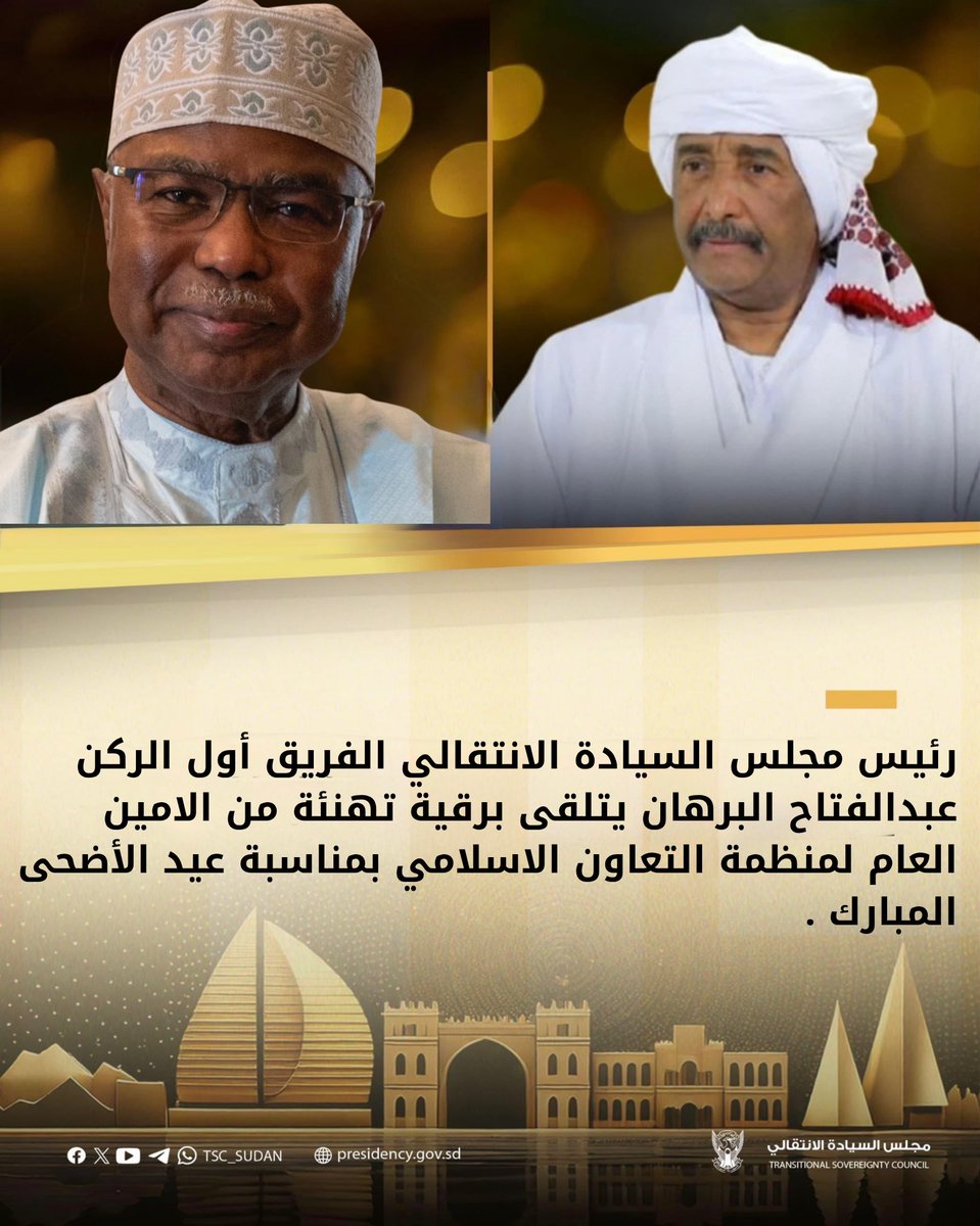 ⭕️ رئيس مجلس السيادة الانتقالي الفريق أول الركن #عبدالفتاح_البرهان يتلقى برقية تهنئة من الأمين العام لمنظمة التعاون الإسلامي #حسين_ابراهيم_طه ، بمناسبة عيد الأضحى المبارك .