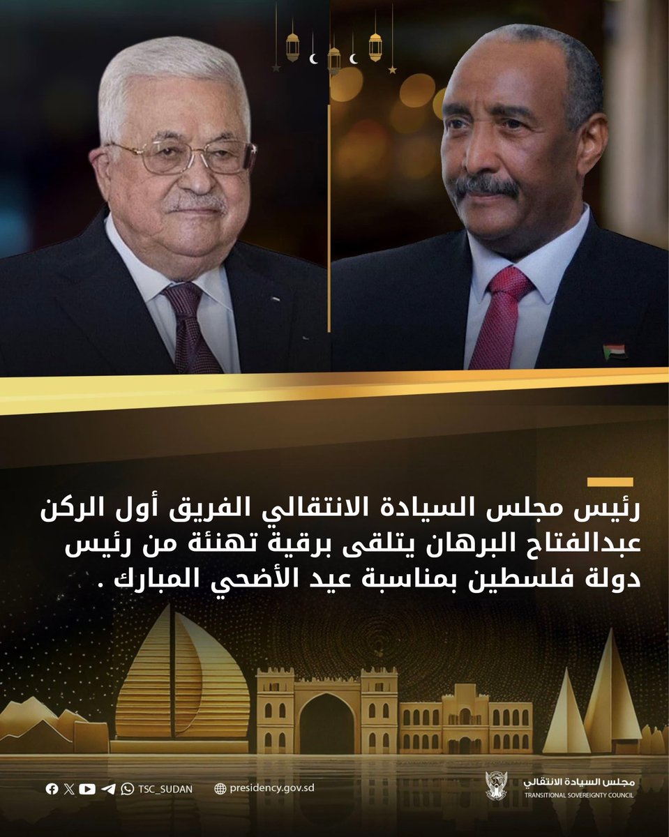 ⭕️ رئيس مجلس السيادة الانتقالي الفريق أول الركن #عبدالفتاح_البرهان يتلقى برقية تهنئة من رئيس دولة فلسطين صاحب الفخامة #محمود_عباس_أبو_مازن ، بمناسبة عيد الأضحى المبارك .