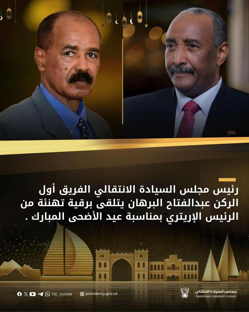 ⭕️ رئيس مجلس السيادة الانتقالي الفريق أول الركن #عبدالفتاح_البرهان يتلقى برقية تهنئة من رئيس دولة أرتريا صاحب الفخامة #أسياس_أفورقي ، بمناسبة عيد الأضحى المبارك .
