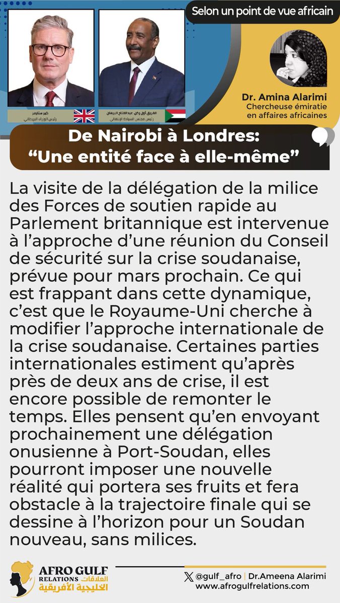 2️⃣ الإرتباك الذي أحاط بوفد مليشيا #الدعم_السريع وهم تحت قبة البرلمان البريطاني لم يكن خافياً على أعضاءه، ويكفي المرء منا أن يقرأ التيه الذي ظهر في مُقلة مستشار قائد المليشيا “عمران عبدالله” وهو يحاول عبثاً إخفاء ما أبدته ملامحه، فإنعكس ذلك على تصريحه الذي أدلى به بالدارجية السودانية “الحكومة دي إنولدت بأسنانها” في دلالة واضحة على تمني ما لا يطال، وما زاد الموقف أسى هو إعلان “عمران” بأنهم سيتوجهون إلى الولايات المتحدة الأمريكية والإتحاد الأوروبي لإضفاء صبغة شرعية على كيان لم يحظى بإهتمام الإعلام في تلك الوجهات الدولية التي قصدوها، ولا أعلم إن كان السيد عمران مُدركاً كفاية لقواعد الإستراتيجيات الأمنية والإستخباراتية في المخيلة الغربية خاصة فيما يتعلق بالقارة الإفريقية⏪️ يتبع