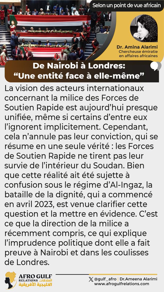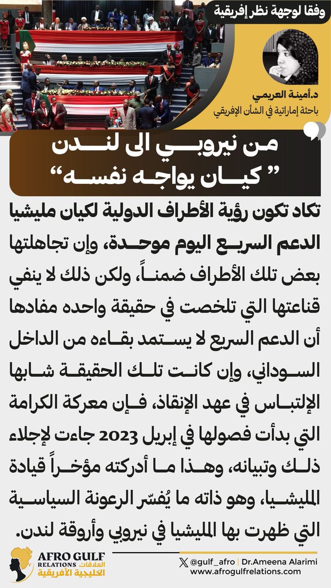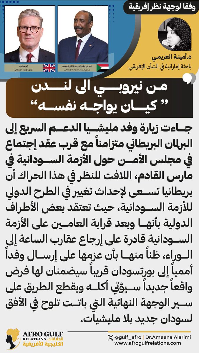1️⃣ تكاد تكون رؤية الأطراف الدولية لكيان وقيادة مليشيا الدعم السريع اليوم موحدة وإن تجاهلتها بعض تلك الأطراف ضمناً، ولكن ذلك لا ينفي قناعتها التي تلخصت في حقيقة واحده مفادها أن الدعم السريع لا يستمد بقاءه من الداخل السوداني، وإن كانت تلك الحقيقة شابها الإلتباس في عهد الإنقاذ فإن معركة الكرامة التي بدأت فصولها في إبريل 2023 جاءت لإجلاء ذلك وتبيانه، وهذا ما أدركته مؤخراً قيادة المليشيا وكافة منتسبيها، وهو ذاته ما يفسر الرعونة السياسية التي ظهرت بها المليشيا في نيروبي وأروقة لندن.