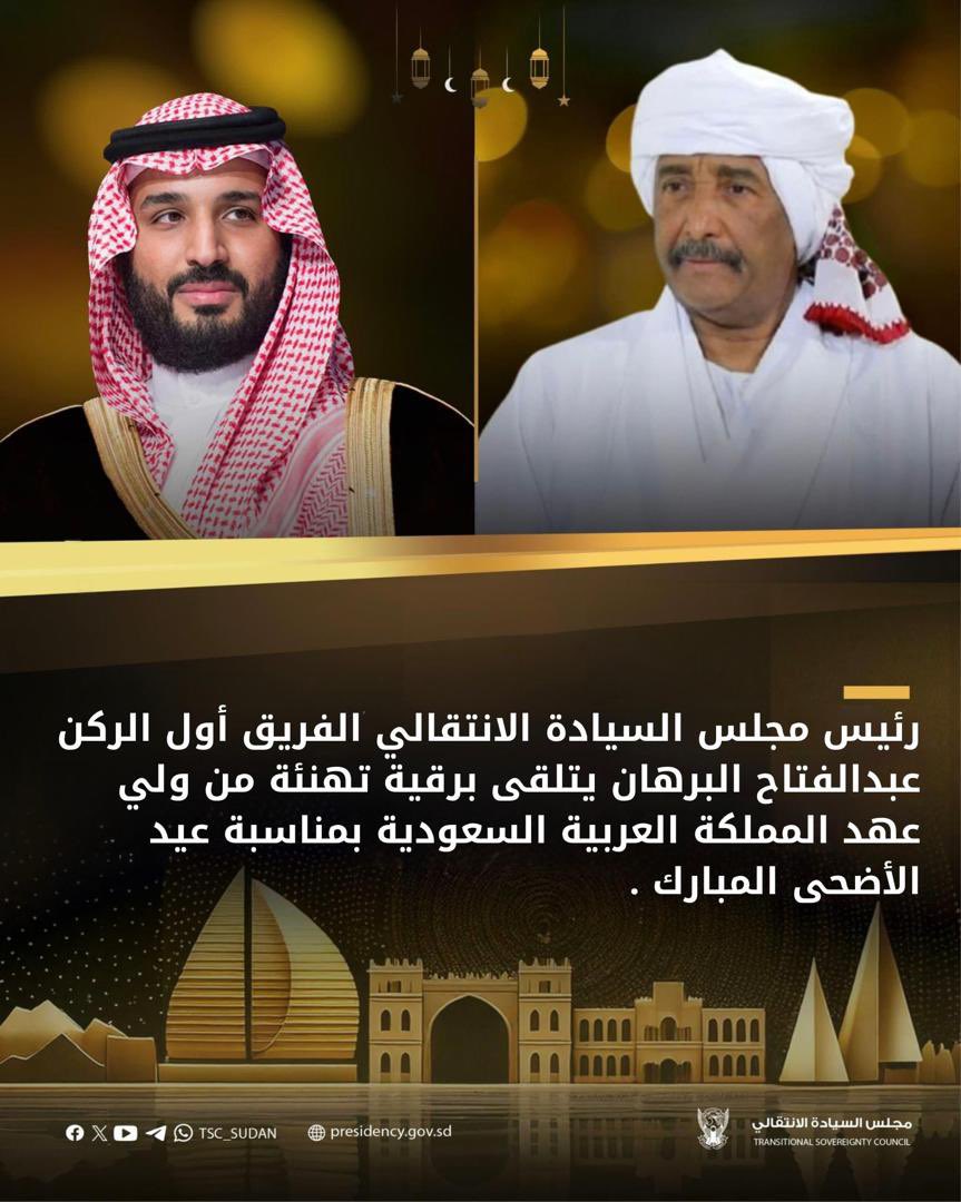 ⭕️ رئيس مجلس السيادة الانتقالي الفريق أول الركن #عبدالفتاح_البرهان يتلقى برقية تهنئة من ولي عهد المملكة العربية السعودية صاحب السمو الملكي. الأمير #محمد_بن_سلمان ، بمناسبة عيد الأضحى المبارك .