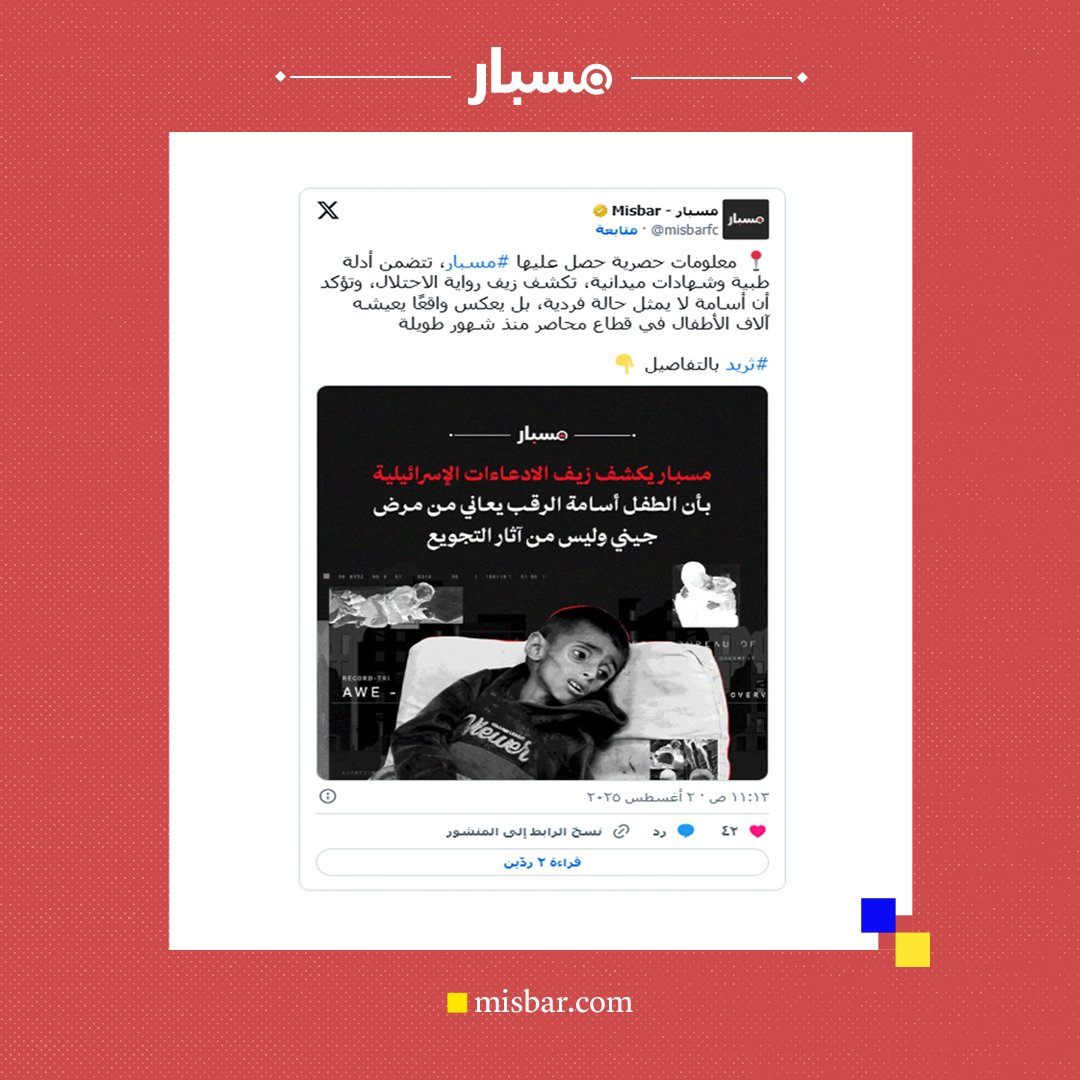 ⭕️ من جانبه، اعتبر منير البرش، المدير العام لوزارة الصحة في غزة، في تصريح لمسبار، أن تحسّن حالة أسامة بعد وصوله إلى إيطاليا دليل على أن معاناته لم تكن نتيجة مرض جيني، بل بسبب سوء التغذية.