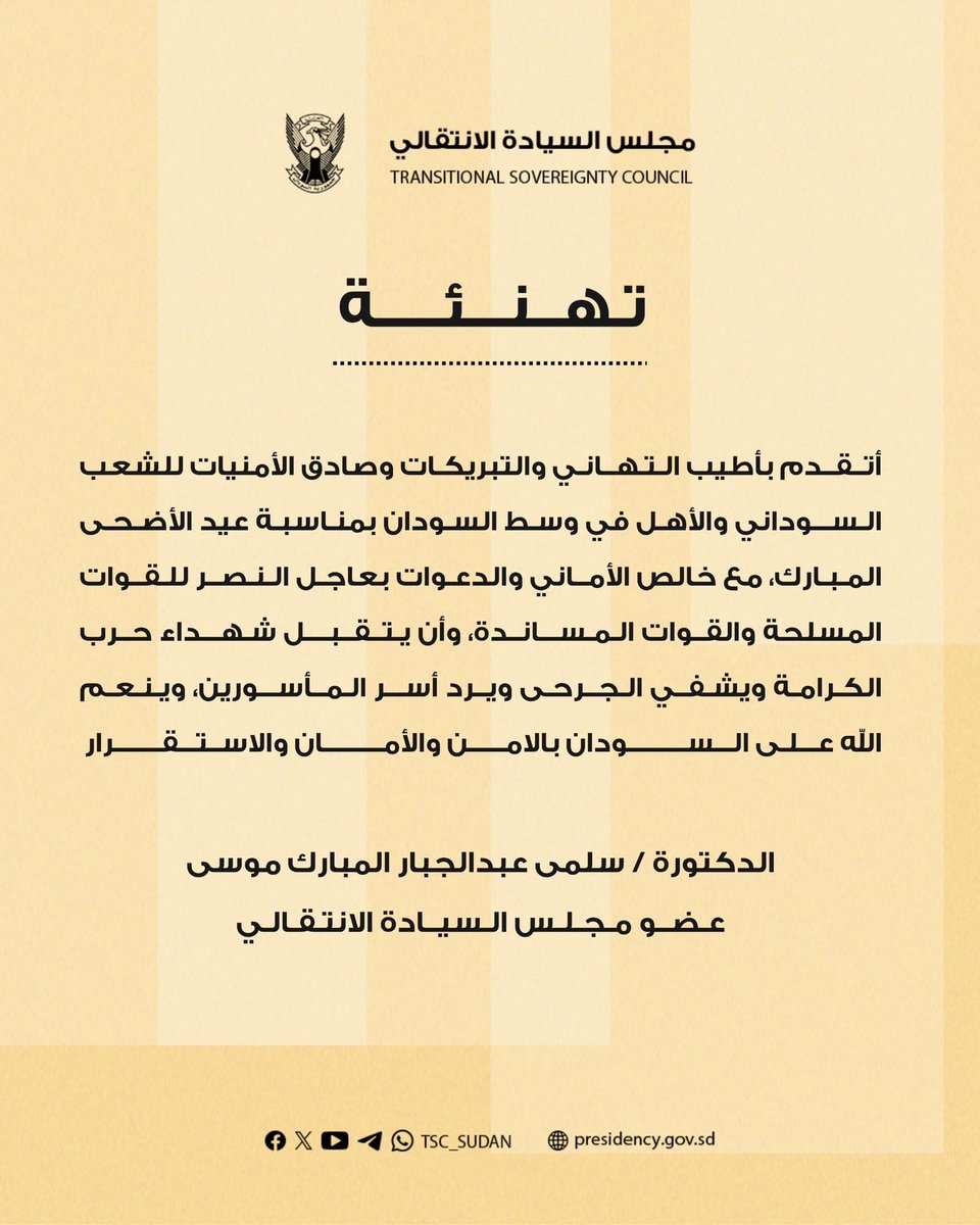 ⭕️ تهنئة عضو مجلس السيادة الانتقالي الدكتورة / سلمى عبد الجبار المبارك موسى بمناسبة عيد الأضحى المبارك