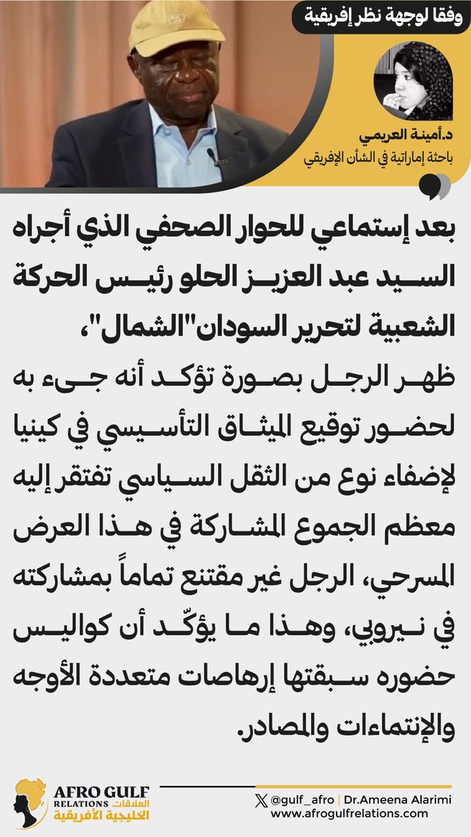 1️⃣ بعد إستماعي للحوار الصحفي الذي أجراه السيد عبد العزيز الحلو رئيس الحركة الشعبية لتحرير السودان – الشمال، ظهر الرجل بصورة تؤكد أنه جىء به لإضفاء نوع من الثقل السياسي تفتقر إليه معظم الجموع المشاركة في هذا العرض المسرحي، الرجل غير مقتنع تماماً بمشاركته في #نيروبي، وهذا ما يؤكّد أن كواليس حضوره سبقتها إرهاصات متعددة الأوجه والإنتماءات والمصادر.⏪️⏪️ يتبع