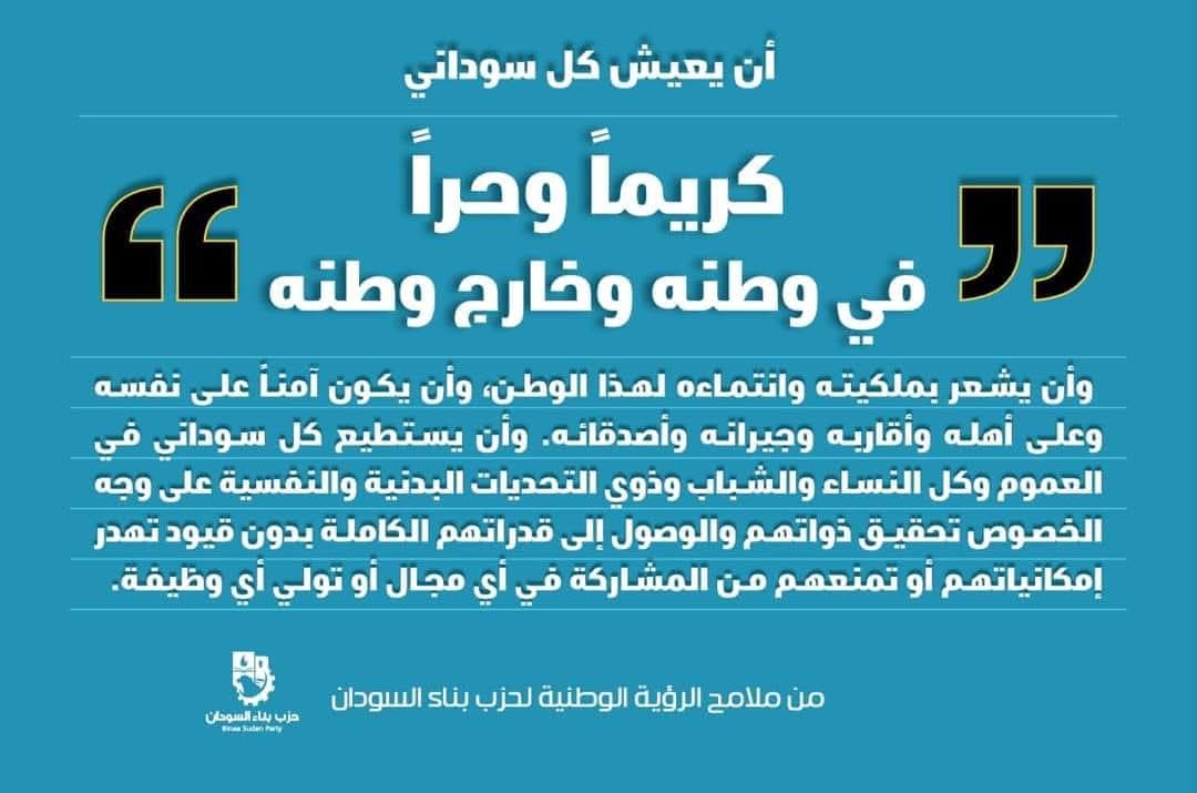أن يعيش كل سوداني كريماً وحراً في وطنه وفي خارج وطنه، وأن يشعر بملكيته وانتماءه لهذا الوطن، وأن يكون آمناً على نفسه وعلى أهله وأقاربه وجيرانه وأصدقائه. وأن يستطيع كل سوداني في العموم وكل النساء والشباب وذوي التحديات البدنية والنفسية على وجه الخصوص تحقيق ذواتهم والوصول إلى قدراتهم الكاملة بدون قيود تهدر إمكانياتهم أو تمنعهم من المشاركة في أي مجال أو تولي أي وظيفة.