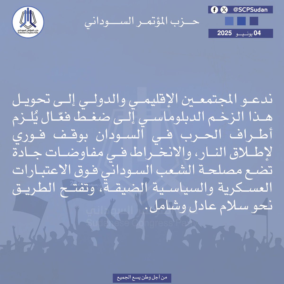 المؤتمر السوداني : ندعو المجتمعين الإقليمي والدولي إلى تحويل هذا الزخم الدبلوماسي إلى ضغط فعّال يُلزم أطراف الحرب في السودان بوقف فوري لإطلاق النار، والانخراط في مفاوضات جادة تضع مصلحة الشعب السوداني فوق الاعتبارات العسكرية والسياسية الضيقة، وتفتح الطريق نحو سلام عادل وشامل.