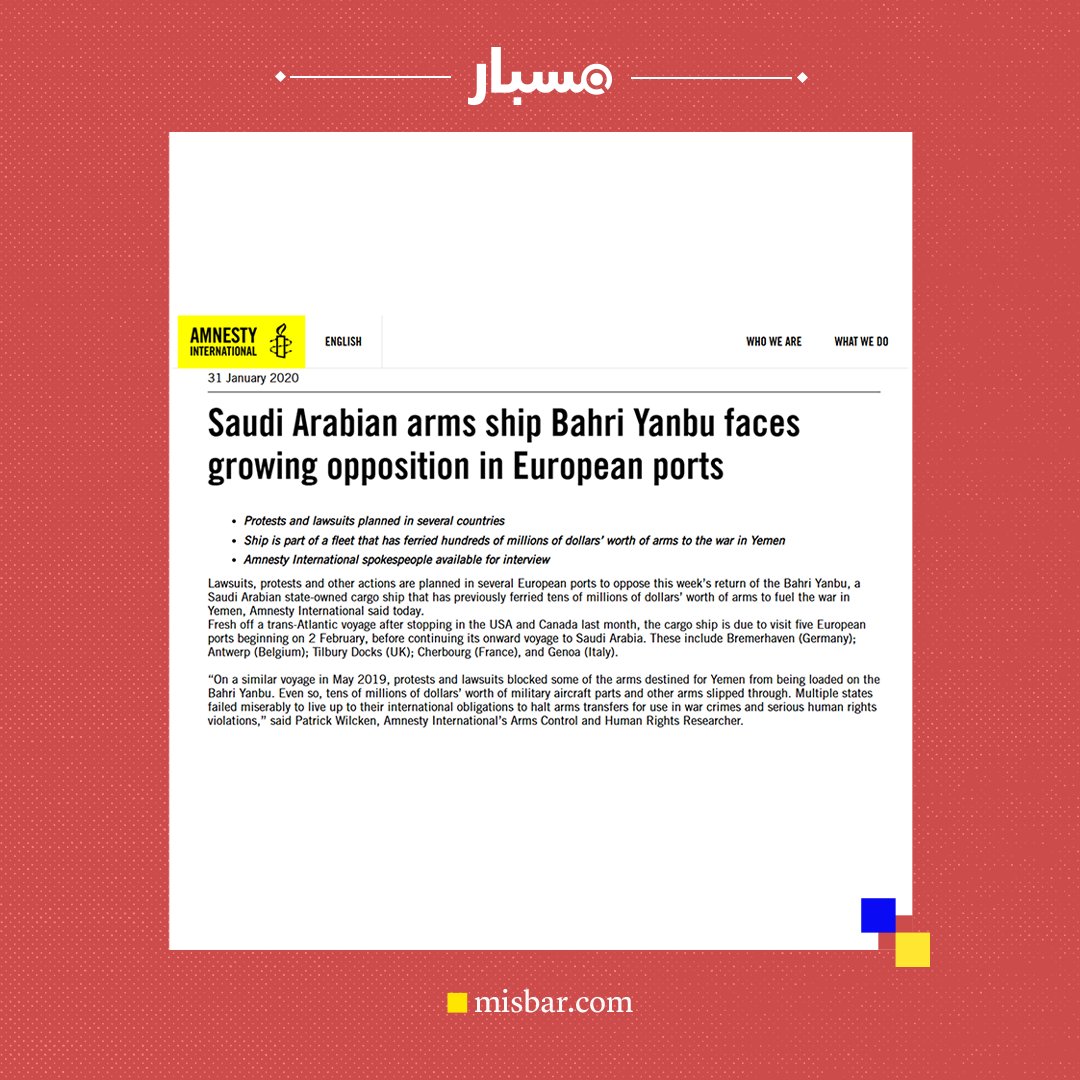 🧵 وفي عام 2020، أعلنت منظمة العفو الدولية عن خطط لرفع دعاوٍ قضائية واحتجاجات وإجراءات أخرى في عدة موانئ أوروبية، اعتراضًا على عودة سفينة الشحن “بحري ينبع” المملوكة للسعودية، والتي سبق أن نقلت أسلحة بقيمة عشرات الملايين من الدولارات لتأجيج الحرب في اليمن.