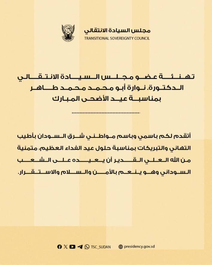 ⭕️ تهنئة عضو مجلس السيادة الانتقالي الدكتورة. نوارة أبو محمد محمد طاهر بمناسبة عيد الأضحى المبارك