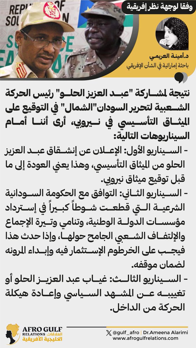 🔆 السيناريو الأول: الإعلان عن إنشقاق عبد العزيز الحلو من الميثاق التأسيسي، وهذا يعني العودة إلى ما قبل توقيع ميثاق #نيروبي، مما سيفتح الباب على مصراعيه لإنشقاقات أخرى سيدرك بعدها أصحابها الفرق بين أجندة الدولة الوطنية ودولة الأجندة.