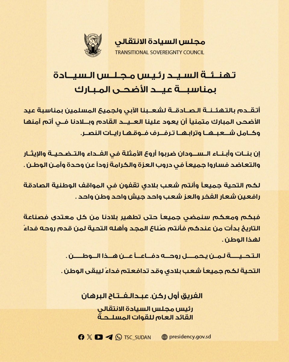 مجلس السيادة تهنئة السيد رئيس مجلس السيادة بمناسبة عيد الأضحى المبارك … By null Published August 19, 2025 Share SHARE Facebook Twitter Pinterest LinkedIn[ad_1] ⭕️ تهنئة السيد رئيس مجلس السيادة بمناسبة عيد الأضحى المبارك [ad_2] Source by مجلس السيادة الإنتقالي – السودان Facebook Twitter Pinterest LinkedIn Share This Article Facebook Twitter Email Print Previous Article Additionally, I briefed them on the positive shifts in the positions of some cou… Next Article اليوم صدرت نتيجة فحص ال DNA الأرفع و الأكثر دقة . تحوري النهائي على السلالة الع… Leave a Comment Leave a Reply Cancel replyYour email address will not be published. Required fields are marked *Comment * Name * Email * Website Save my name, email, and website in this browser for the next time I comment. Δ SearchSearchRecent Postsأكرمنا الله صباح اليوم الأحد بلقاء إخوةٍ كرام، على ضفة النيل الأزرق، حيث شاي الش… أعلن بنك السودان المركزي في منشور إدارة السياسات رقم (2025/15) رفع الاحتكار عن ا… ندوة بعنوان: القانون الدولي والسيادة الوطنية قراءة في موقف السودان من لجنة تقصي … والي نهر النيل تستقبل وزير الموارد البشرية والرعاية الاجتماعية الوزير يشيد بالأ… كامل ادريس: رئيس اللجنة السياسية لمؤسسات الدولة السودانية. Recent CommentsNo comments to show.