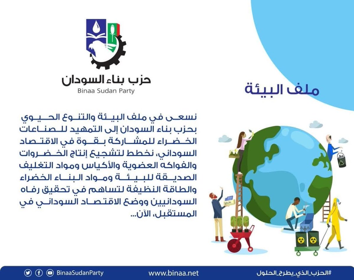 حزب بناء السودان يدعوكم للانضمام إلينا في تبني سياسات مستدامة تحافظ على مواردنا للأجيال القادمة. معًا، نصنع فرقًا!