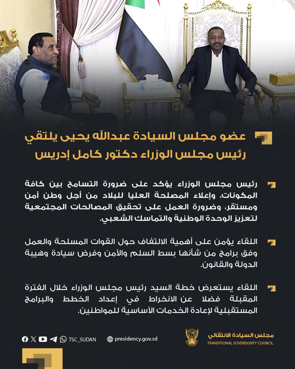 مجلس السيادة عضو مجلس السيادة عبدالله يحيى يلتقي رئيس مجلس الوزراء دكتور كامل إدريس بورتسود… By null Published August 19, 2025 Share SHARE Facebook Twitter Pinterest LinkedIn[ad_1] ⭕️ عضو مجلس السيادة عبدالله يحيى يلتقي رئيس مجلس الوزراء دكتور كامل إدريس بورتسودان ٤-٦-٢٠٢٥م [ad_2] Source by مجلس السيادة الإنتقالي – السودان Facebook Twitter Pinterest LinkedIn Share This Article Facebook Twitter Email Print Previous Article التقيت اليوم بعدد من أبناء وبنات الجالية السودانية المقيمة في رواندا، حيث هدف ال… Next Article عبدالرحمن عمسيب: قرار اعتبار الإمارات دولة عدوة يجب أن يُراجع فوراً لآثره الفادح… Leave a Comment Leave a Reply Cancel replyYour email address will not be published. Required fields are marked *Comment * Name * Email * Website Save my name, email, and website in this browser for the next time I comment. Δ SearchSearchRecent Postsأكرمنا الله صباح اليوم الأحد بلقاء إخوةٍ كرام، على ضفة النيل الأزرق، حيث شاي الش… أعلن بنك السودان المركزي في منشور إدارة السياسات رقم (2025/15) رفع الاحتكار عن ا… ندوة بعنوان: القانون الدولي والسيادة الوطنية قراءة في موقف السودان من لجنة تقصي … والي نهر النيل تستقبل وزير الموارد البشرية والرعاية الاجتماعية الوزير يشيد بالأ… كامل ادريس: رئيس اللجنة السياسية لمؤسسات الدولة السودانية. Recent CommentsNo comments to show.