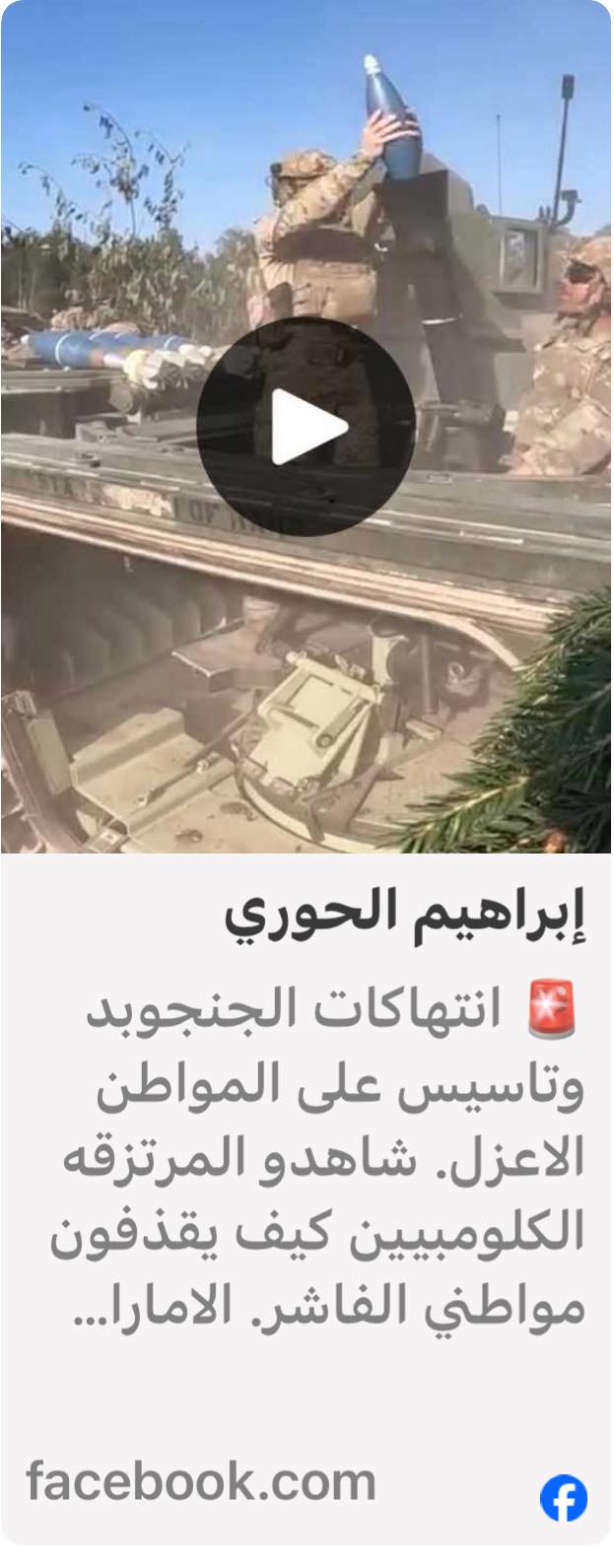 ضمن سلسلة الضحك على الدقون التي تمارسها سلطة بورتسودان قام العميد ابراهيم الحوري بنشر فيديو قديم من العراق للجيش الامريكي مدعياً انهم مرتزقة كولمبيون يقاتلون في السودان !