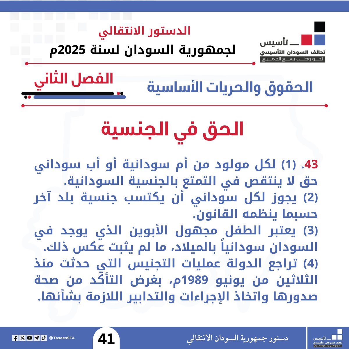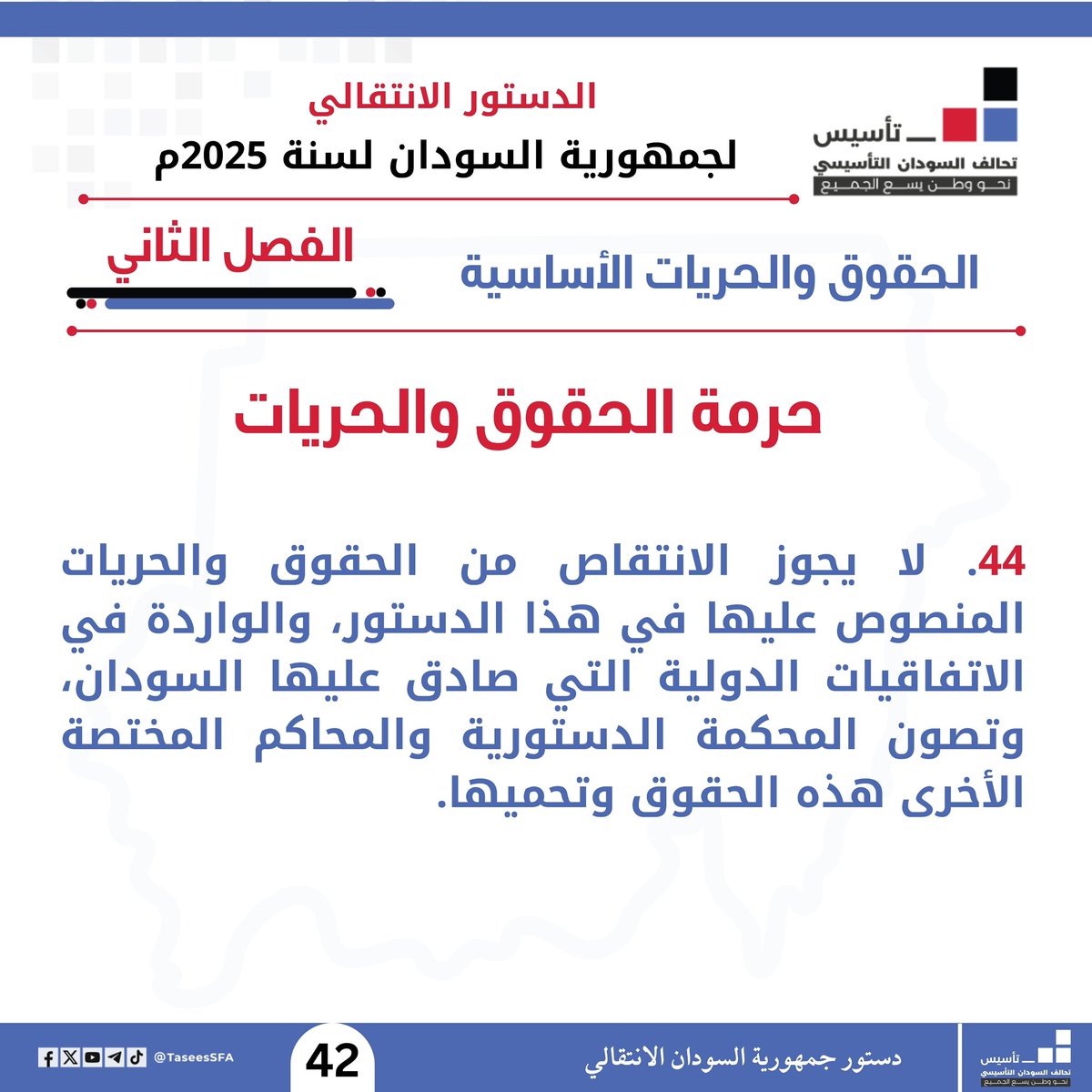 تحالف السودان التأسيسي تأسيس الدستور الانتقالي لجمهورية السودان لسنة 2025 م الباب الثاني – الفصل الثاني ال… By null Published August 19, 2025 Share SHARE Facebook Twitter Pinterest LinkedIn[ad_1] الدستور الانتقالي لجمهورية السودان لسنة 2025 م الباب الثاني – الفصل الثاني الحقوق والحريات الأساسية #تحالف_السودان_التأسيسي #تأسيس #السودان [ad_2] Source by تحالف السودان التأسيسي – (تأسيس) Facebook Twitter Pinterest LinkedIn Share This Article Facebook Twitter Email Print Previous Article الثلاثية من جديد وتجلس معها في طاولة البحث عن خدعة تعطل الشارع الثائر. إلتقط ال… Next Article ••• بسم الله الرحمن الرحيم حزب الأمة القومي مجلس التنسيق *بيان صحافي* ع… Leave a Comment Leave a Reply Cancel replyYour email address will not be published. Required fields are marked *Comment * Name * Email * Website Save my name, email, and website in this browser for the next time I comment. Δ SearchSearchRecent Postsأكرمنا الله صباح اليوم الأحد بلقاء إخوةٍ كرام، على ضفة النيل الأزرق، حيث شاي الش… أعلن بنك السودان المركزي في منشور إدارة السياسات رقم (2025/15) رفع الاحتكار عن ا… ندوة بعنوان: القانون الدولي والسيادة الوطنية قراءة في موقف السودان من لجنة تقصي … والي نهر النيل تستقبل وزير الموارد البشرية والرعاية الاجتماعية الوزير يشيد بالأ… كامل ادريس: رئيس اللجنة السياسية لمؤسسات الدولة السودانية. Recent CommentsNo comments to show.
