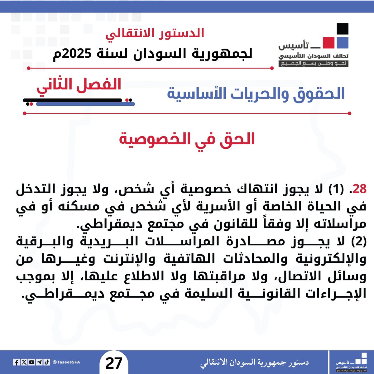 تحالف السودان التأسيسي تأسيس الدستور الانتقالي لجمهورية السودان لسنة 2025 م الباب الثاني – الفصل الثاني ال… By null Published August 20, 2025 Share SHARE Facebook Twitter Pinterest LinkedIn[ad_1] الدستور الانتقالي لجمهورية السودان لسنة 2025 م الباب الثاني – الفصل الثاني 🔴الحقوق والحريات الأساسية #تحالف_السودان_التأسيسي #تأسيس #السودان [ad_2] Source by تحالف السودان التأسيسي – (تأسيس) Facebook Twitter Pinterest LinkedIn Share This Article Facebook Twitter Email Print Previous Article حددت فيه اللجنة الأمنية وقف التفاوض من جانبها، ولم يشر الى ما يسمى بالمسهلين لإن… Next Article ︎︎︎ بسم الله الرحمن الرحيم حزب الامة القومي بيان صحفي عقدت مجموعة من نواب ا… Leave a Comment Leave a Reply Cancel replyYour email address will not be published. Required fields are marked *Comment * Name * Email * Website Save my name, email, and website in this browser for the next time I comment. Δ SearchSearchRecent Postsأكرمنا الله صباح اليوم الأحد بلقاء إخوةٍ كرام، على ضفة النيل الأزرق، حيث شاي الش… أعلن بنك السودان المركزي في منشور إدارة السياسات رقم (2025/15) رفع الاحتكار عن ا… ندوة بعنوان: القانون الدولي والسيادة الوطنية قراءة في موقف السودان من لجنة تقصي … والي نهر النيل تستقبل وزير الموارد البشرية والرعاية الاجتماعية الوزير يشيد بالأ… كامل ادريس: رئيس اللجنة السياسية لمؤسسات الدولة السودانية. Recent CommentsNo comments to show.
