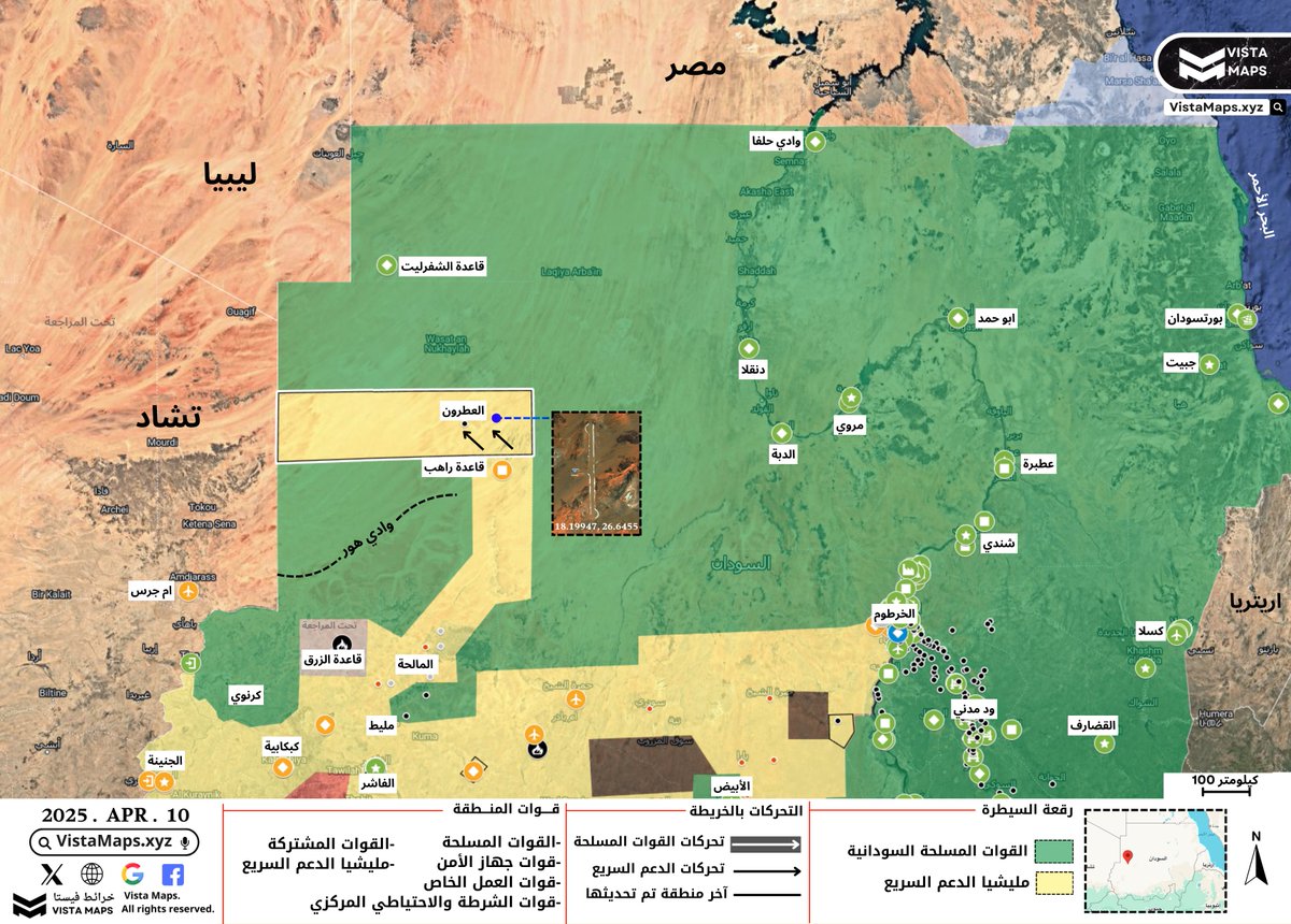 – سيطرت مليشيا الدعم السريع في الصحراء قبل أيام على واحة العطرون ومدرج طائرات عقب سيطرتها على قاعدة راهب، ويُرجح أنها تسعى للتقدم نحو قاعدة الشفرليت في الولاية الشمالية بالقرب من الحدود الليبية بهدف تأمين طريق إمداد بري قادم من ليبيا.