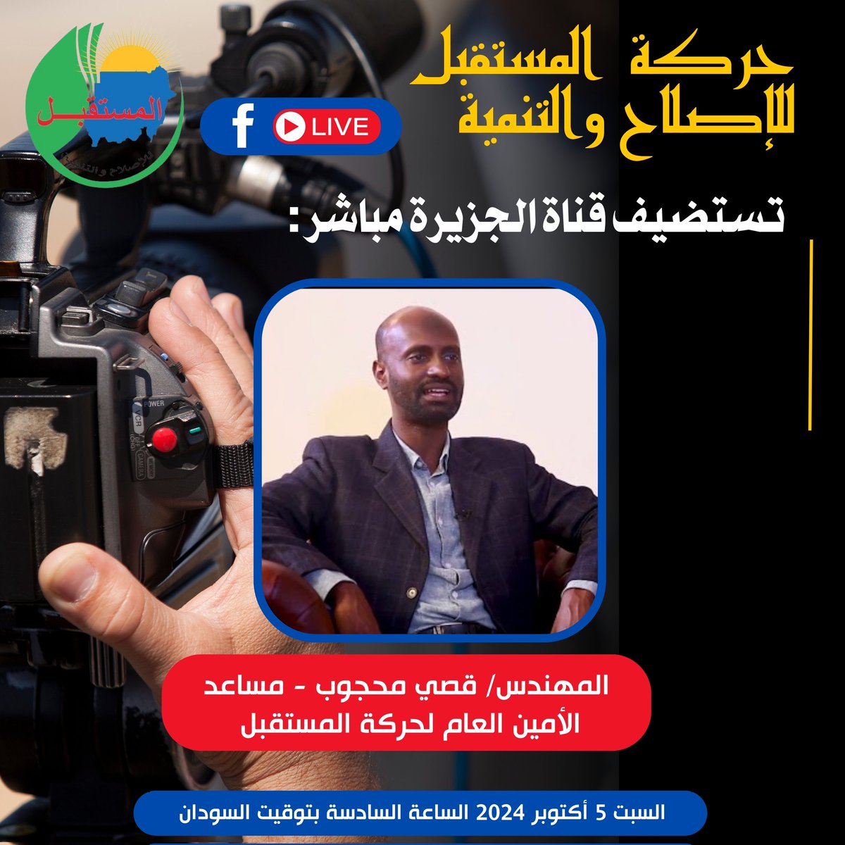 تستضيف قناة الجزيرة مباشر بعد قليل المهندس/ قصي محجوب مساعد الأمين العام لحركة المستقبل للإصلاح والتنمية حول قضايا الراهن.