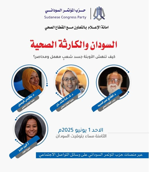وذلك يوم الأحد 1 يونيو 2025 ، الساعة الثامنة بتوقيت السودان . وسيتم بث الندوة عبر منصات حزب المؤتمر السوداني على وسائل التواصل الاجتماعي .
