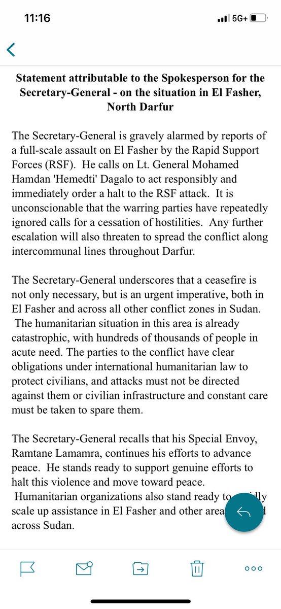Well coming this call from UN secretary general. I hope all international community including African union take responsibilities to stop ethnic cleansing in Al Fashir .