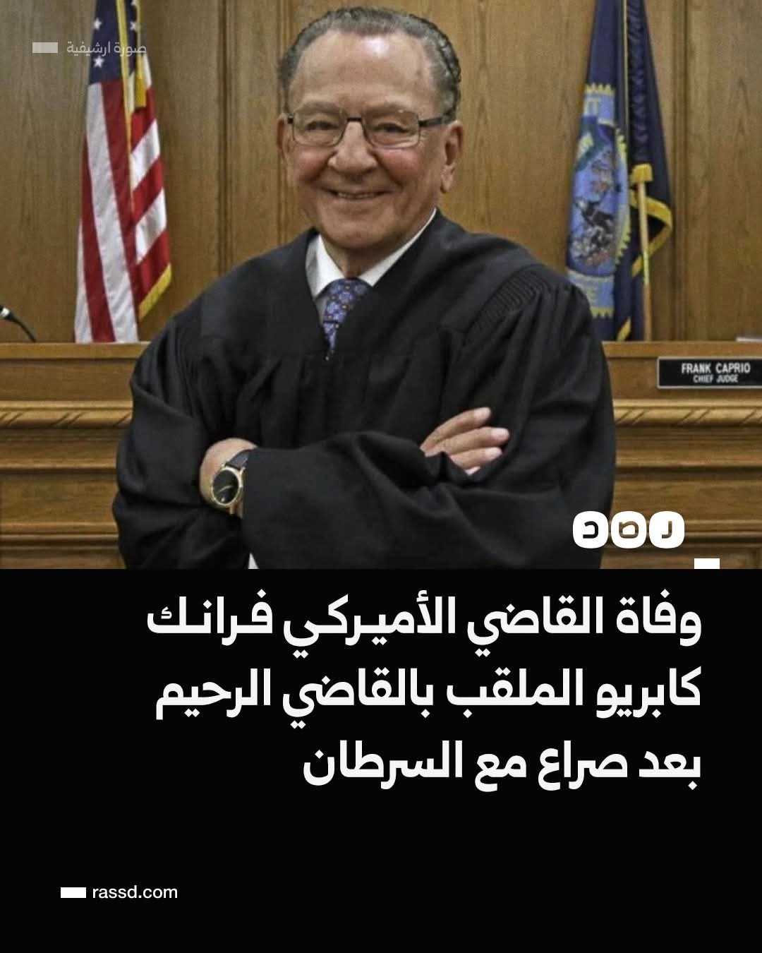 وفاة القاضي الأميركي فرانك كابريو، الملقب بالقاضي الرحيم، بعد صراع مع السرطان، وقد اشتهر بإصدار أحكام تتسم بالرحمة بحق متهمين، ومراعاته لظروفهم.