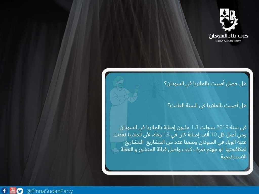 ما مكافحة الملاريا بس لكن بنخطط في حزب بناء السودان لمحاربة كل الأمراض المعدية زي الإيدز والسل والليشمانيا والبلهارسيا وروماتيزم القلب والمايستوما،