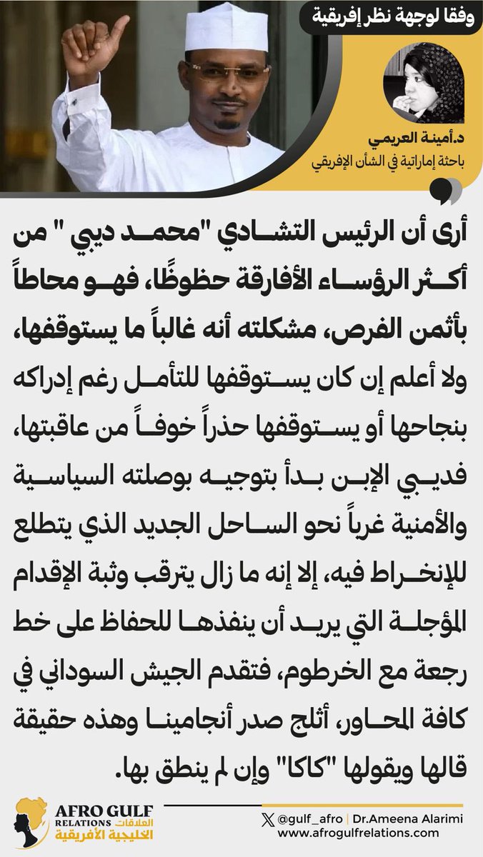 ❇️ تشاد: الرئيس التشادي محمد ديبي أراه محاطاً بأثمن الفرص، مشكلته أنه غالباً ما يستوقفها، ولا أعلم إن كان يستوقفها للتأمل رغم إدراكه بنجاحها أو يستوقفها حذراً خوفاً من عاقبتها، فديبي الأبن بدأ بتوجيه بوصلته السياسية والأمنية غرباً نحو الساحل الجديد الذي يتطلع للإنخراط فيه، إلا إنه ما زال يترقب وثبة الإقدام المؤجلة التي يريد أن ينفذها للحفاظ على خط رجعة مع #الخرطوم ، فتقدم الجيش السوداني في كافة المحاور، أثلج صدر أنجامينا وهذه حقيقة قالها ويقولها ديبي الأبن وإن لم ينطق بها، وفي ظل قناعة الخرطوم بتطوير رؤيتها لمفهوم الأمن الإقليمي والتوجه غرباً لدول الساحل الإفريقي، أرى أن ذلك سيساهم في إعادة فتح ملف الطلب التشادي للقاء القيادة السودانية، ومستقبلاً ستعمل أنجامينا ومن خلال حركة العدل والمساواة على الدخول في مثلت التعاون والتكامل الذي يجمع الجيش السوداني مع الحركات المسلحة الداعمة له لتحجيم دور #الدعم_السريع في غرب السودان تحوطاً من تمكن عناصرها من الشرق التشادي وخلق بؤرة صراع قد تكون القاصمة لحكم “الزغاوة” في تشاد.