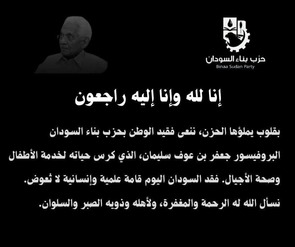 بقلوب يملؤها الحزن، ننعي بحزب بناء السودان فقيد الوطن البروفيسور جعفر بن عوف سليمان، الذي كرس حياته لخدمة الأطفال وصحة الأجيال.