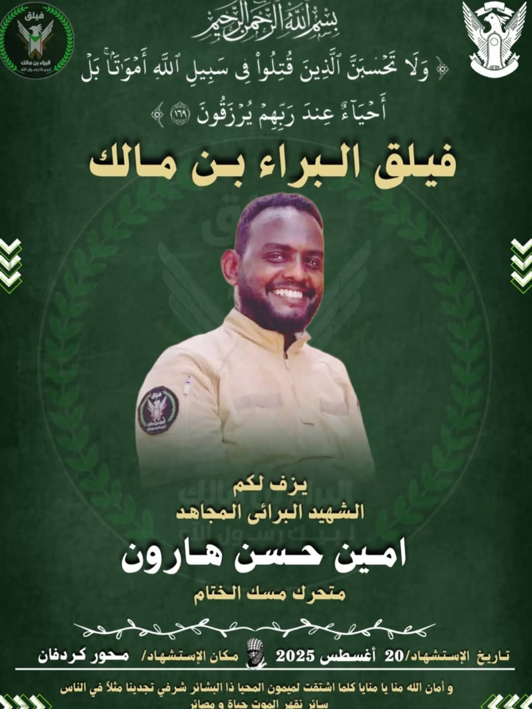 الشـ٥ـيد أمين حسن هارون مسؤول إلإستخبارات بمشروع أشبال البراء بن مالك .. أحد أبـ.ـطال المدرعات سابقا.. أصيب سابقاً بطـ.ـلق نـ.ـاري إخترق العنق وخرج ليترك جرحا غائرا.. فما لبث أمين حتى رجع لميدان الفداء دون أن يستكين أو يرتاح ، فأكمل مع إخوته نظافة ولاية الخرطوم وانطلق منها لسهول كردفان حيث لقي الأحبة النعمان وصحبه..