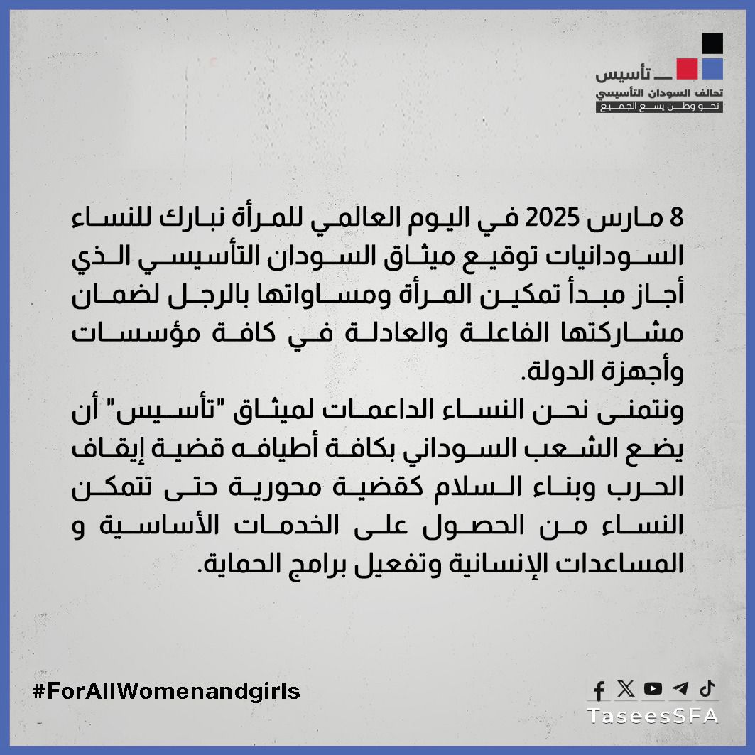 8 مارس 2025 في اليوم العالمي للمرأة نبارك للنساء السودانيات توقيع ميثاق السودان التأسيسي الذي أجاز مبدأ تمكين المرأة ومساواتها بالرجل لضمان مشاركتها الفاعلة والعادلة في كافة مؤسسات وأجهزة الدولة.