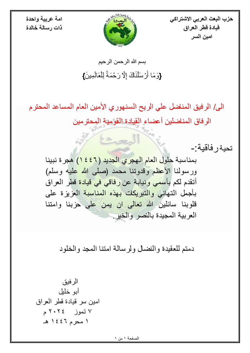 بمناسبة حلول العام الهجري الجديد ( ١٤٤٦) هجرة نبينا ورسولنا الأعظم وقدوتنا محمد (صلى الله عليه وسلم) أتقدم لكم بأسمي ونيابة عن رفاقي في قيادة قطر العراق بأجمل التهاني والتبريكات بهذه المناسبة العزيزة على قلوبنا سائلين الله تعالى ان يمن على حزبنا وامتنا العربية المجيدة بالنصر والخير .