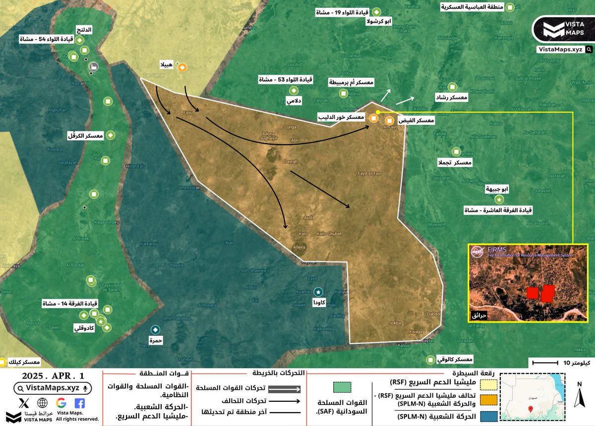 – منحت الحركة الشعبية مناطق سيطرتها الشرقية لمليشيا الدعم السريع، وساندت تقدمها نحو خور الدليب ومعسكر القوات المسلحة مما أدى إلى انسحاب القوات المسلحة من المنطقة والاتجاه شرقًا نحو محلية رشاد ومعسكر أم برمبيطة بعد معركة كبيرة، في المقابل يتم تداول أنباء عن عودة الجيش واستعادته السيطرة على المنطقة.