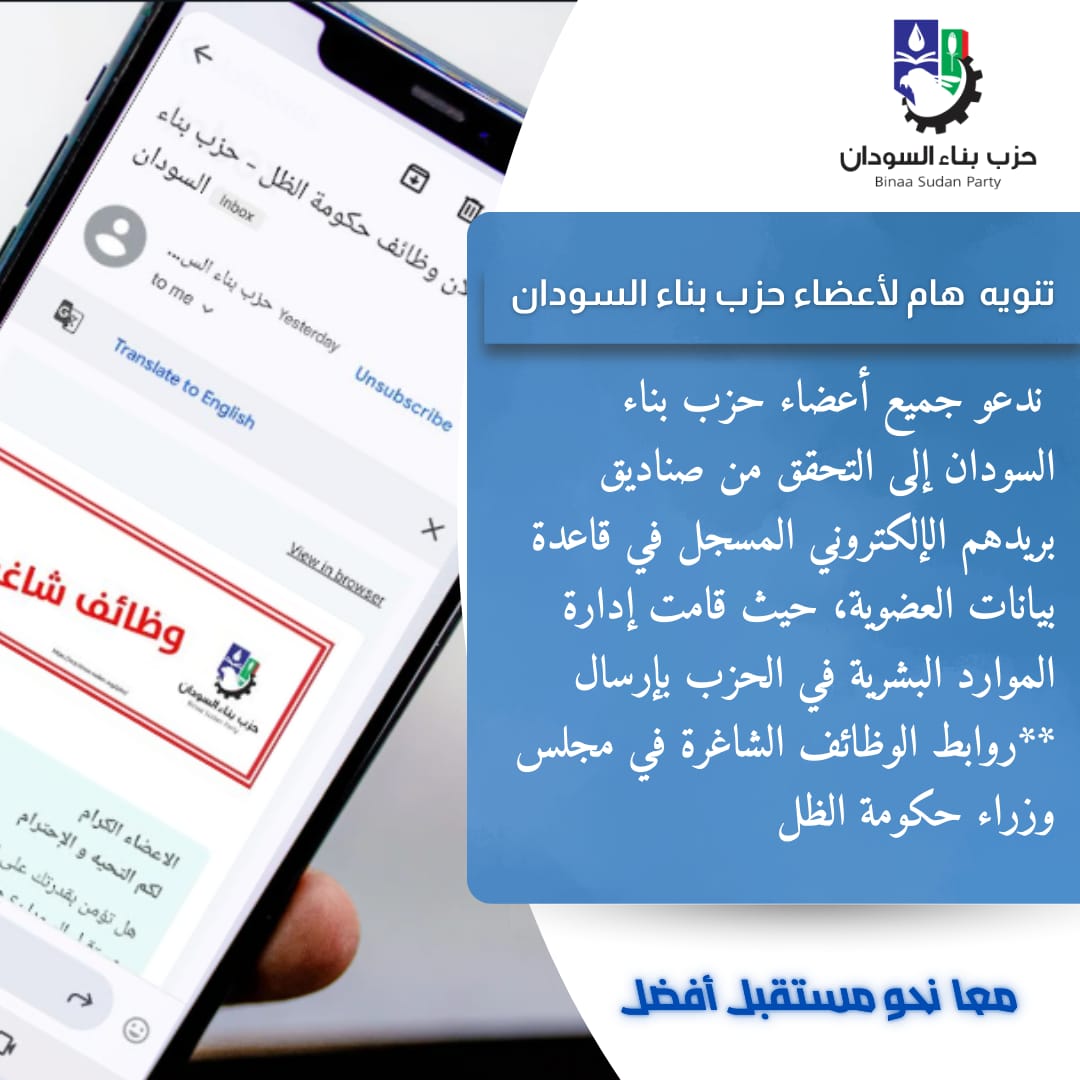 ندعو جميع أعضاء حزب بناء السودان إلى التحقق من صناديق بريدهم الإلكتروني المسجل في قاعدة بيانات العضوية، حيث قامت إدارة الموارد البشرية في الحزب بإرسال روابط الوظائف الشاغرة في مجلس وزراء حكومة الظل.