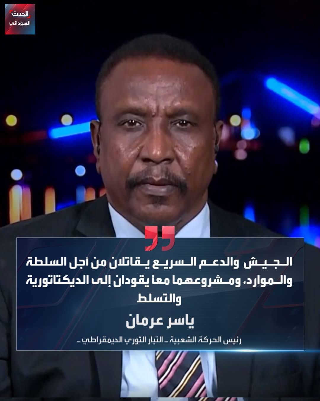 قال رئيس الحركة الشعبية – التيار الثوري الديمقراطي، ياسر عرمان، إن القوات المسلحة وقوات الدعم السريع يتبنيان خطابات متناقضة بشأن الحرب؛ إذ يصفها الجيش بأنها “حرب الكرامة”، في حين تصفها قوات الدعم السريع بأنها “هدم دولة 56”.