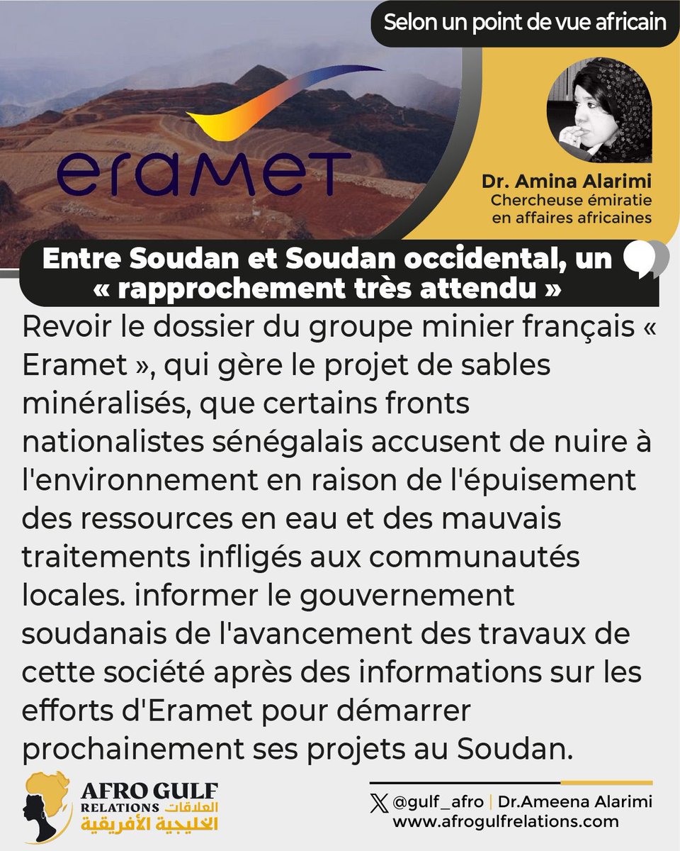 3️⃣ الوقوف على ملف مجموعة التعدين الفرنسية “Eramet” التي تدير مشروع الرمال المعدنية والتي تتهمها بعض الجبهات الوطنية السنغالية بأنها تلحق الضرر بالبيئة بسبب إستنرافها لموارد المياه وإساءة معاملة المجتمعات المحلية، والقصد من الوقوف على هذا الملف هو إطلاع الحكومة السودانية على سير عمل تلك الشركة بعد توارد أنباء عن مساعي “Eramet ” لبدء مشاريعها في السودان قريباً.