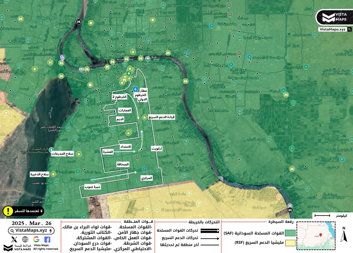 – القوات المسلحة السودانية تفرض سيطرتها على رئاسة مليشيا الدعم السريع ومقرات استخباراتها، بالاضافة الى مطار الخرطوم الدولي والأحياء السكنية التالية: