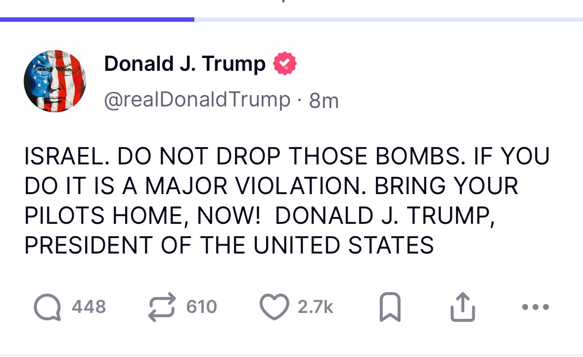 🚨 بعد إعلان #إسرائيل إنها ستضرب #ايران بعد ان اتهمتها بخرق وقف إطلاق النار ، #ترمب يقول بالخط العريض: “اسرائيل لا ترمي تلك القنابل. إذا فعلت هذا سيعد خرقا” كبيرا”. أعيدي طياريك إلى بلادهم الان!”