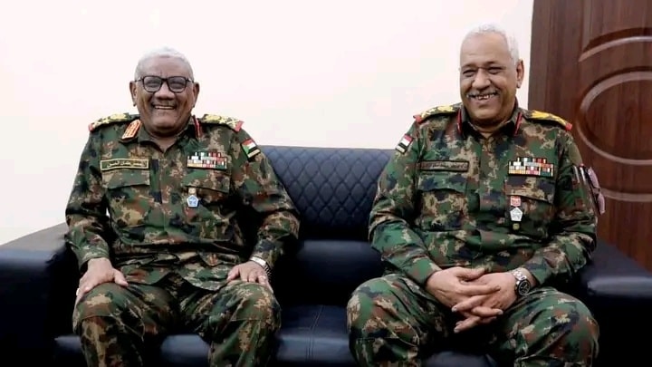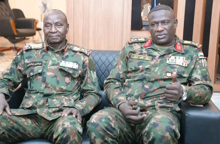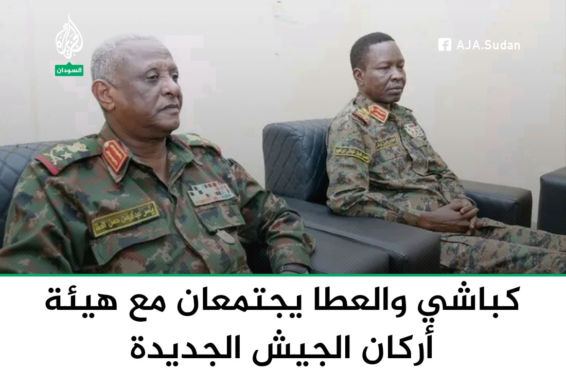 عضو مجلس السيادة ونائب قائد الجيش شمس الدين كباشي، وعضو المجلس ومساعد قائد الجيش ياسر العطا، يجتمعان مع هيئة أركان القوات المسلحة السودانية الجديدة بالخرطوم