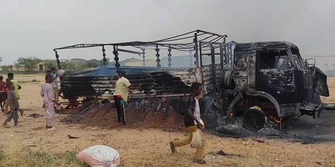 وعندما قررت منظمة الاغذية العالمية التدخل وانقاذ الموقف بتحريك قافلة من المساعدات الانسانية والاغذية تحركت سرب من مسياراتهم لتقصف القافلة وتقتل افرادها وتحرق المساعدات المتجهة لانقاذ اهل دارفور والمحاصرون في الفاشر ..
