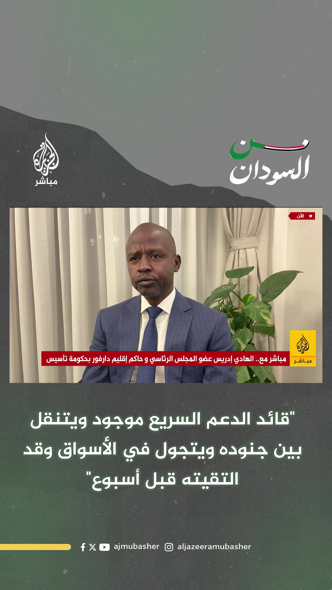 حاكم إقليم دارفور بحكومة تأسيس الهادي إدريس: قائد الدعم السريع موجود ويتنقل بين جنوده ويتجول في الأسواق وقد التقيته قبل أسبوع
