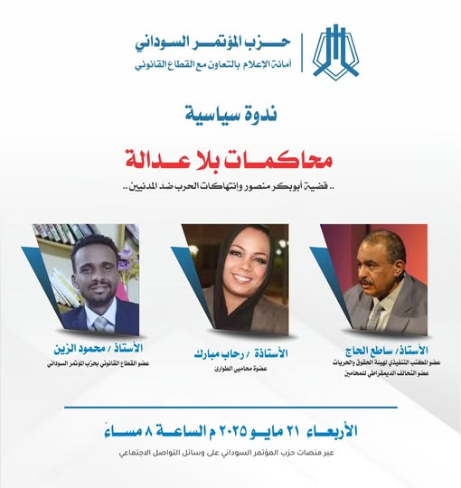 وذلك يوم الأربعاء 21 مايو 2025م ، الساعة 8 مساءً بتوقيت السودان ، وسوف يتم بث الندوة عبر منصات حزب المؤتمر السوداني على وسائل التواصل الاجتماع.
